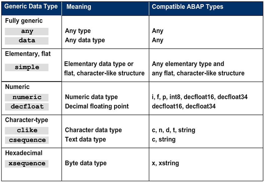 In addition to complete data types, ABAP also features a number of generic data types. In contrast to complete types, you cannot use generic types to define the properties of data objects. You only use generic types to type formal parameters and field symbols.