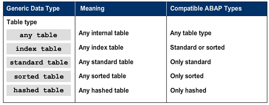 The ANY TABLE, INDEX TABLE, and SORTED TABLE are special generic data types that are only compatible with internal tables.