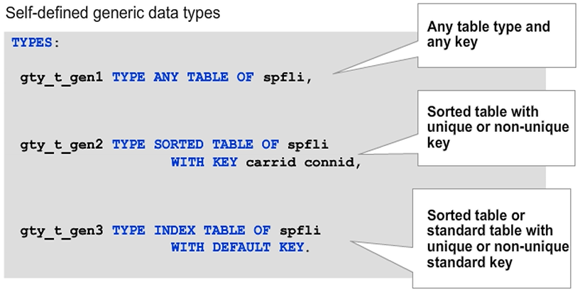 In addition to these built-in generic table types, ABAP also contains generic table types that developers create as generic types. These generic table types are created either in the ABAP Dictionary or in the program source code with the TYPES statement.