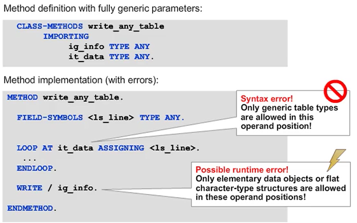 The syntax check ensures that the system passes only actual parameters with compatible types to generically typed formal parameters. However, when generically typed parameters are addressed in ABAP statements, you often cannot determine whether the type of the underlying data object or its current content is logical in the respective operand position until runtime. If conflicts occur, the system raises runtime errors that cannot be caught in most cases. The figure shows an example.