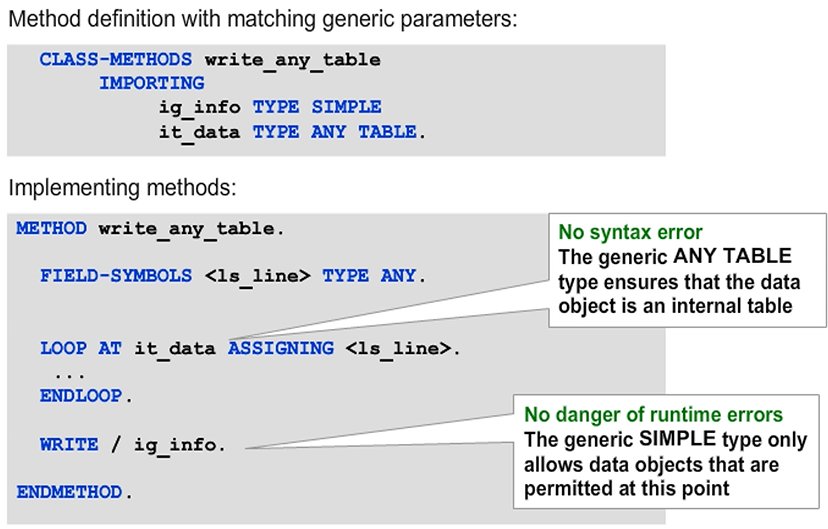 When you generically type formal parameters of a procedure, such as a subroutine, function module, or method, the procedure becomes more flexible. Use the syntax check to ensure that the procedure handles the different types.