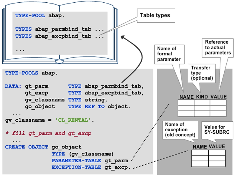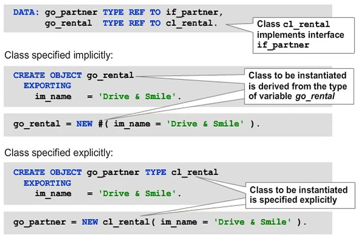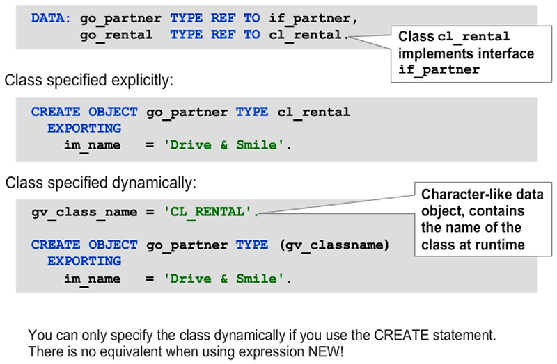 Usually, the type of the object (that is, the class to be instantiated) is defined implicitly through the static type of the reference variable used. Alternatively, you can use statement CREATE OBJECT with the TYPE addition to specify the class to be instantiated in the CREATE OBJECT statement.
