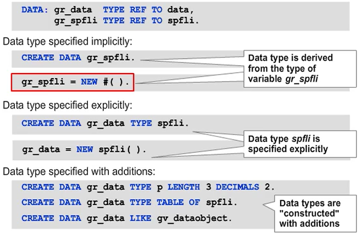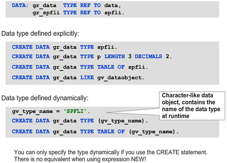 As with CREATE OBJECT, you can define the type of the data object implicitly by using the type of the reference variable, or explicitly by using the TYPE addition. If you use explicit typing, you can use a number of variants that you might be familiar with from DATA declarations. These variants include the use of built-in types, the implicit construction of table types, and the reference to an existing data object with LIKE.