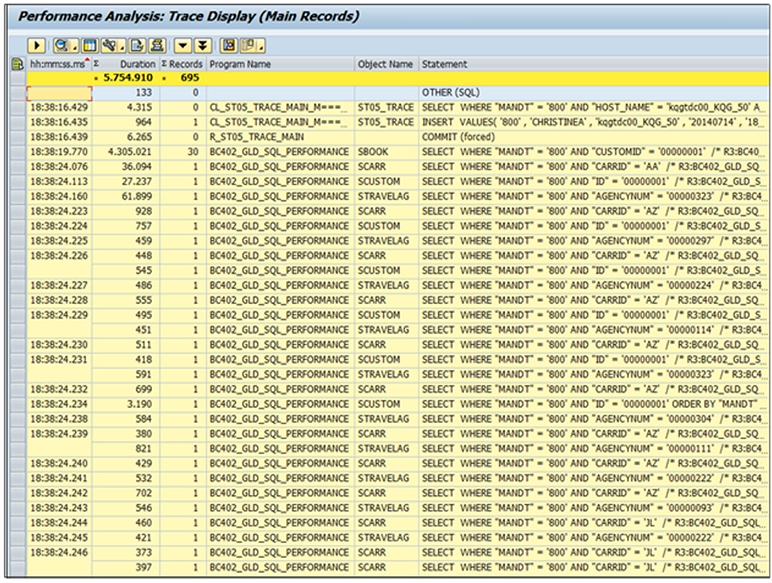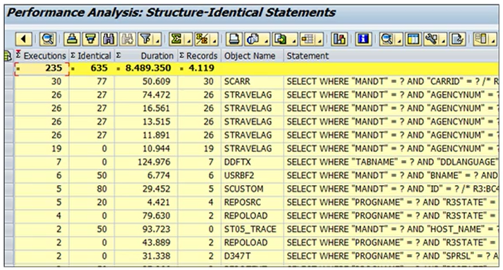 From within the trace list, to display an overview of how many identically structured SQL statements were performed for the various tables and/or views, choose Trace → Structure-identical Statements . Identically structured statements use the same access strategy, possibly with different values for the bind variables.