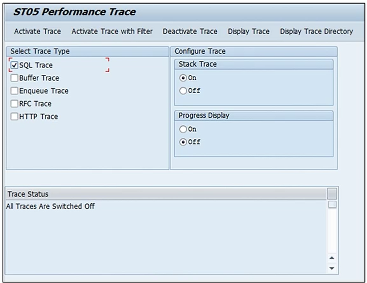 The SQL trace allows you to precisely analyze and track the database accesses that the database interface in the SAP system initiates. This makes the trace an effective tool for performance analysis. To start the SQL performance trace, enter transaction code ST05 or choose System → Utilities → Performance Trace.