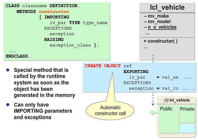 The instance constructor is a special instance method in a class and is always named CONSTRUCTOR. The constructor is automatically called at runtime with the CREATE OBJECT statement.