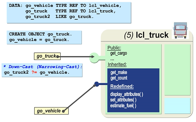 After assigning this type of reference back to a subclass reference to the implementing class, clients are no longer limited to inherited components. In the example shown in the figure, all the components of the LCL_TRUCK instance can be accessed again after the assignment using the GO_TRUCK2 reference.