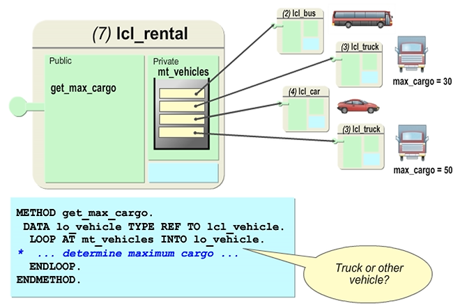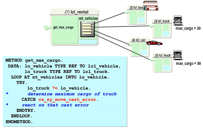 In this example, a car rental company (LCL_RENTAL) has to determine the maximum capacity of its trucks, but it stores all types of vehicle references in an internal table LCL_VEHICLE. There may be a problem if there is no truck reference in the LO_VEHICLE superclass reference at runtime but the downcast assignment operator tries to copy the reference to the now invalid reference LO_TRUCK.