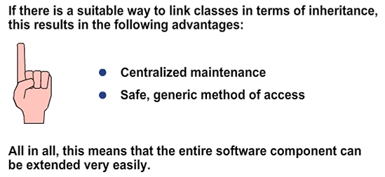 As early as the modeling phase, you can identify a generalization and specialization relationship between certain classes. If such a relationship exists between certain classes, you can use inheritance to represent this in ABAP Objects.