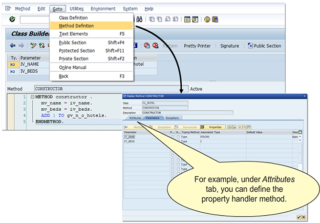 Choose Goto → Method definition to change the attributes of your method during implementation. Optionally, you can define an event handler method on the Attributes tab page in the dialog box.