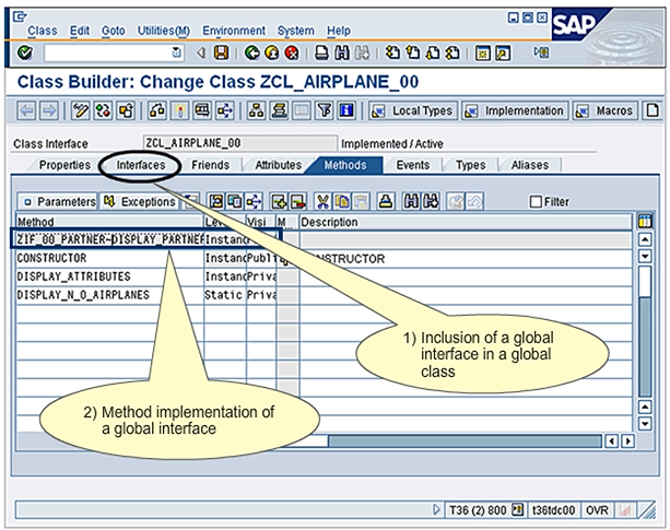 Once you have done that, all of the interface’s components automatically appear on the relevant tab pages according to the naming convention with the interface resolution operator. In the example, the global interface ZIF_00_PARTNER containing the method DISPLAY_PARTNER is incorporated. Double-click the method name to implement the method.