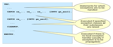 If an exception occurs, the system searches for a matching CATCH statement in the TRY-ENDTRY structure that immediately surrounds the statement. It searches through the CATCH blocks for the relevant exception class or the superclasses from the inheritance hierarchy. If any of the relevant exception classes is found, the program navigates directly to the handler.