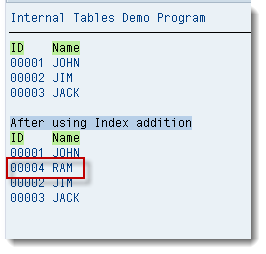 The first INSERT statement without INDEX addition will simply add the record to the end of the internal table. But if we want to insert the line to specific location i.e. if we want to insert it as second record then we need to specify 2 as the index in the INSERT statement.