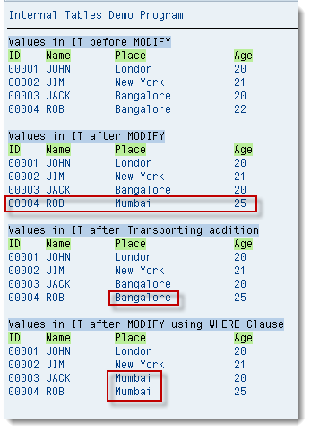 WRITE:/ 'Values in IT after MODIFY using WHERE Clause' COLOR 4.