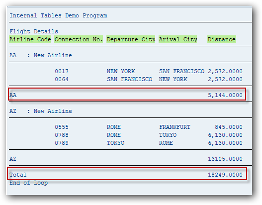 AT NEW and AT END OF event blocks SUM statement finds all the rows within the control level and calculates the totals of numeric fields that are right to the control level and places the totals in the corresponding fields of the work area.