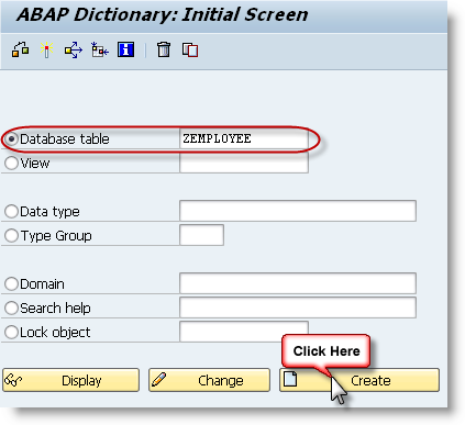 - Go to ABAP dictionary (SE11) to create a SAP table. Enter the name of the table to be created and press enter.