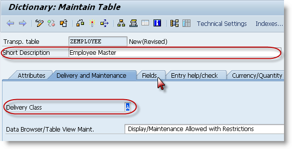 - Enter a proper short description for the table and maintain delivery class as ‘A'(Application Table). Now press on Fields tab to maintain the fields of the table.