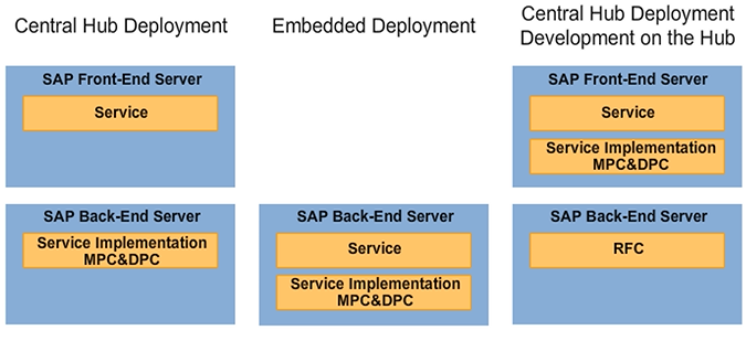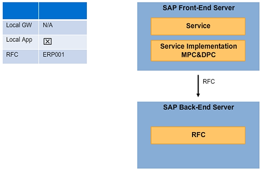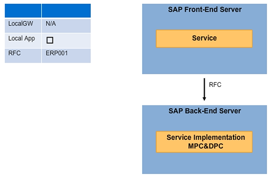 The Gateway server and the service implementation are both located on the same SAP system in the SAP Gateway Hub. However, the business data must be retrieved from an SAP Business Suite back-end system. Therefore, the RFC destination must point to the back end that is remotely called by the service implementation (the MPC and DPC classes).