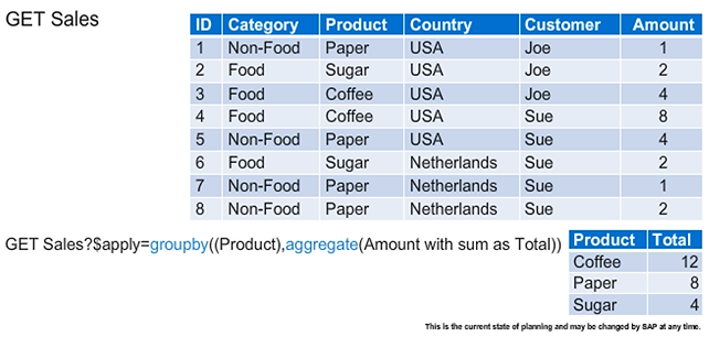 While a simple GET request on the entity set "sales" would retrieve a list, as shown in the upper part of the figure, it is possible to aggregate the data by using query option $apply. In the figure, the sales data is grouped by single products and the sum of the amounts is calculated.