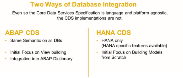 HANA CDS is located on the SAP HANA database directly and is meant to support the development of SAP HANA native applications (SAP HANA XS). It makes liberate use of features which are unique to SAP HANA.