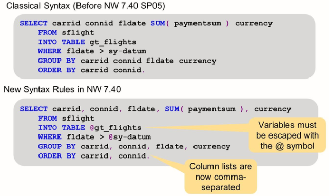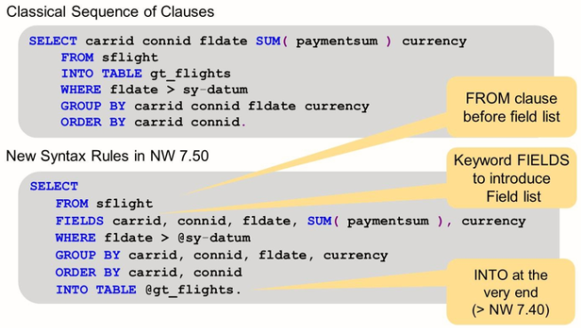 As off AS ABAP 7.40 SP05, ABAP open SQL offers a large variety of new features. In order to make this possible, it was necessary to re-design the syntax of Open SQL. The new syntax rules as off NW 7.40 are as follows: