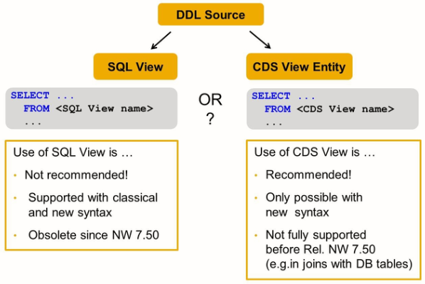 To use CDS in ABAP Open SQL, you can read either from the SQL View or from the CDS view. This might be a bit surprising because only the SQL view exists physically on the database. But if you read from the CDS view, the database interface will replace the name of the CDS view with the name of the corresponding SQL view when translating your open SQL statement into a native SQL statement. This is the recommended way to access CDS view in ABAP.