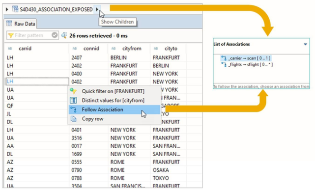 If a CDS view definition contains exposed associations, you can evaluate these associations in Data Preview as follows: