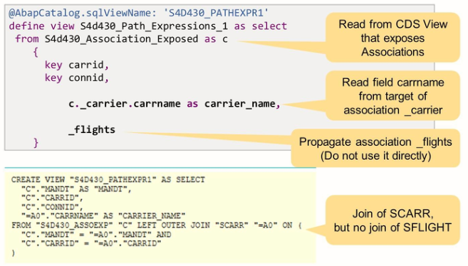 The CDS view in the example above reads data from a CDS view that contains exposed associations. The element list contains a path expression to read field carname from the association target of association _carrier.