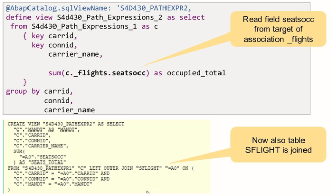 The CDS view in this example reads from the CDS view of the previous example. The element list contains a path expression to read field seatsocc from the association target of association _flights.