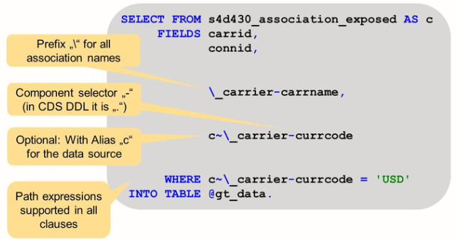As of release 7.50, path expressions also exist in Open SQL. They are supported in all clauses, e.g. the field list, the WHERE clause, the GROUP BY clause, the HAVING clause.