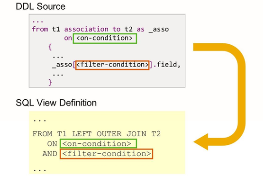 Path expressions in CDS DDL can be extended using a filter condition. The filter condition becomes part of the ON-condition when the system translates the path expression into a join on the database level.