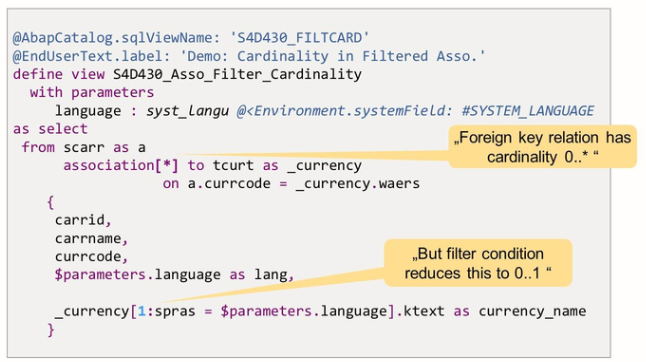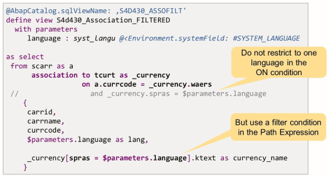 In this example, table tcurt is associated with table scarr. Table tcurt is a so-called text table. It contains names and descriptions for currencies in many different languages. The ON condition of the association defines the basic foreign key relationship between the two tables, i.e., the currency code in table scar is linked to the key field wears in table tcurt.