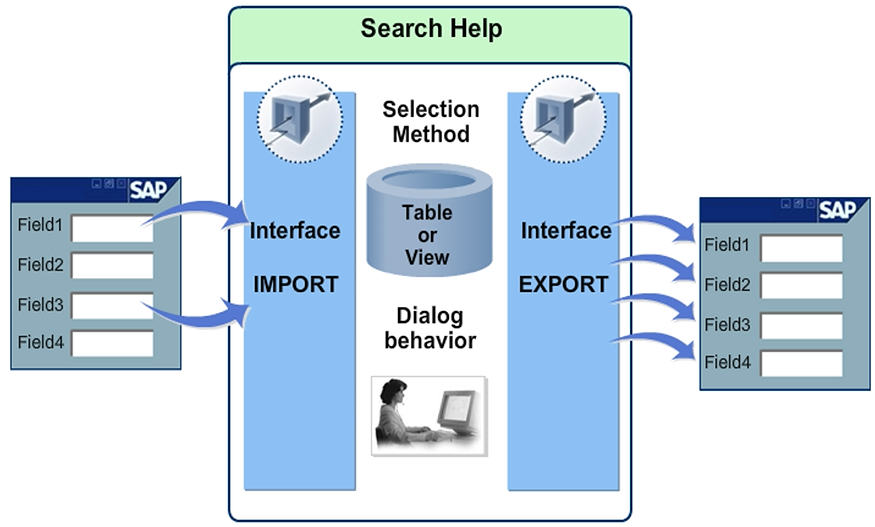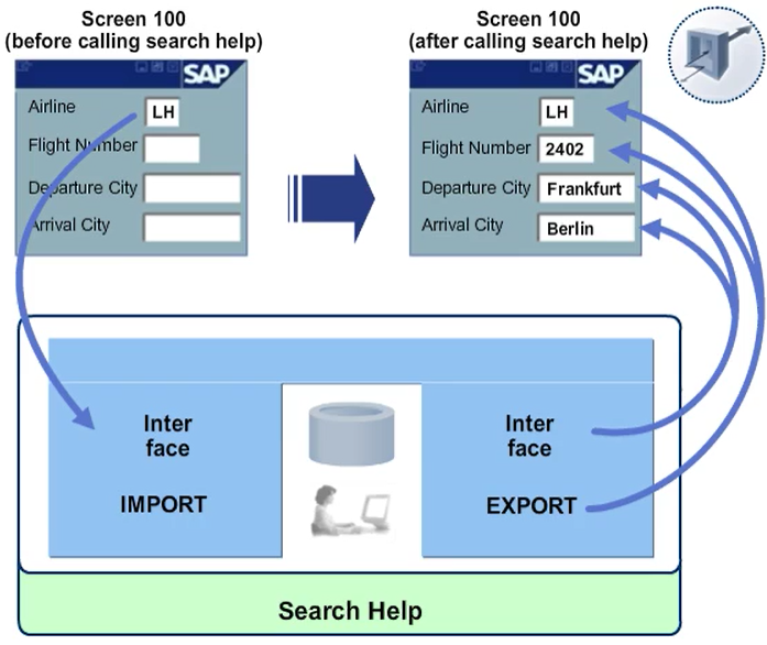 The IMPORT and EXPORT parameters of a search help together make up the interface of the search help. The parameters of a search help can be compared with the parameters of a function module.