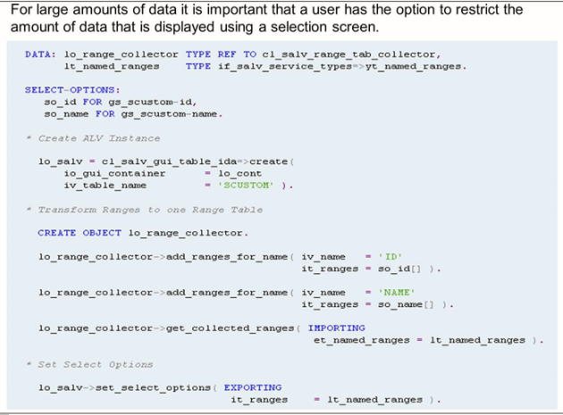 The data retrieval and display are copied from the ALV with IDA. The selection made by the user is transferred to the list using method set_select_options. Use method add_ranges_for_name of class cl_salv_range_tab_collector to convert the selection of the user to the format that is needed for the method set_select_options.