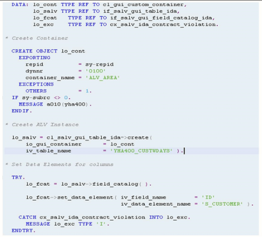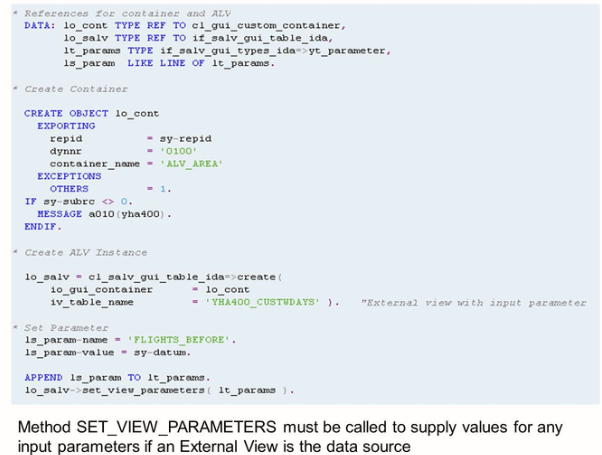 The ALV optimized for SAP HANA can work with external views that have been published to the ABAP Dictionary. The SAP HANA view on which the external view is based on may have input parameters that are used as filters, in calculations, or in scripted logic. For the ABAP application to supply values for these input parameters, they must be passed to the ALV as name-value pairs by calling the method SET_VIEW_PARAMETERS. The query engine transforms these into suitable SAP HANA placeholders and uses them during selection.