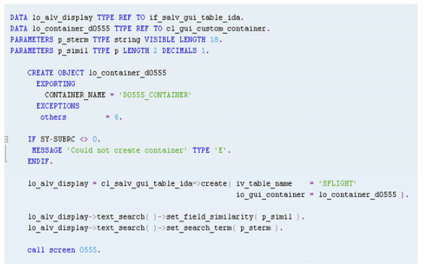 You may want to provide a selection screen in the ABAP application that provides the user with the ability to enter a search term for which they wish to perform a fuzzy search. The ALV API provides methods to do this, as shown in the figure, FUZZY Search Functionality with ALV for SAP HANA.