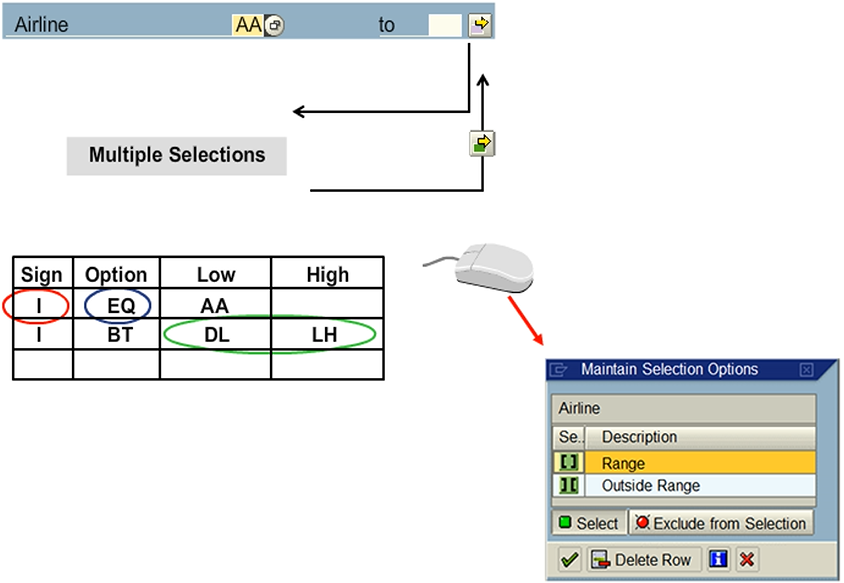 Further selections can be made by choosing the Multiple Selections button to the right of the Select-options fields. A dialog box appears where further values and ranges can be included or excluded.