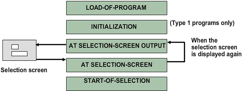 AT SELECTION-SCREEN OUTPUT is processed immediately before, and AT SELECTION-SCREEN immediately after, the selection screen is displayed. Because the selection screen might be displayed multiple times (when the user chooses ENTER, for example), these event blocks can be processed multiple times.