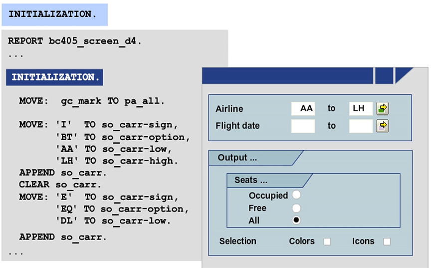 You can overwrite the default value of a PARAMETERS field or a SELECT-OPTIONS object in the INITIALIZATION event. For this reason, this event is appropriate for a dynamic preassignment of the input fields that are displayed on a selection screen. The INITIALIZATION event block is only processed once, before the selection screen is displayed for the first time.