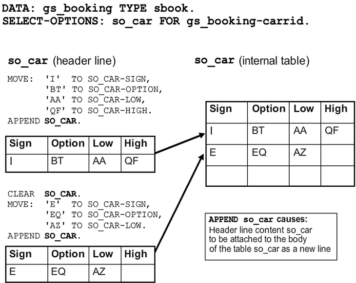 Fill the <sel_opt> work area with correct values and use the APPEND <sel_opt> command to add it to the table body as a new line.
