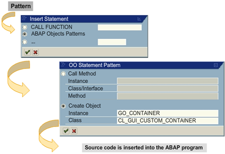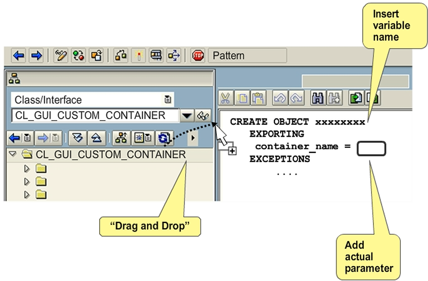For example, you can display the global class cl_gui_custom_container, in the navigation area and drag it to the editing area. The CREATE OBJECT statement, including the signature and exceptions of the instance constructor, is inserted at the current cursor position in the source code of the program. Optional parameters and exceptions are inserted as comments.