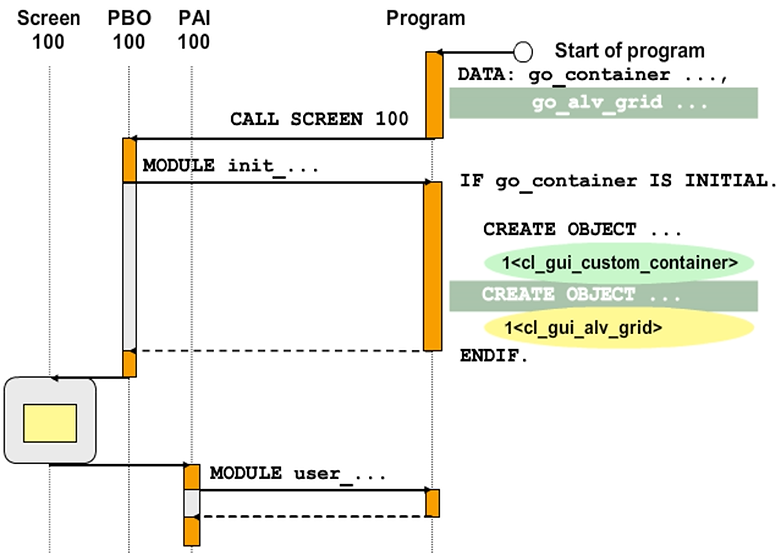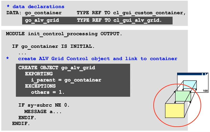 If an error occurs when creating the instance, you must catch the exception. The instance of the ALV Grid is connected to the container and to the container screen using the object reference passed in the interface.