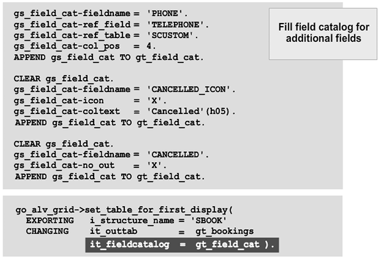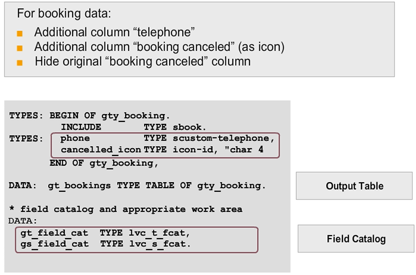The figure shows a semi-automatic field description. A part of the field description comes from the ABAP Dictionary structure (SBOOK) whereas another part is defined in the gt_field_cat field catalog.