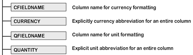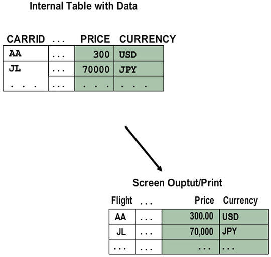 Enter CURRENCY in the cfieldname field of the field catalog for the price column to ensure that contents in the price column are according to the currency specified in the currency column, for example, USD - two decimal places, JPY - no decimal places.