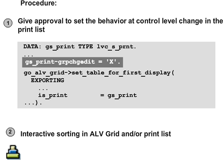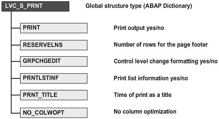 If you assign the value X to the print field, you can use the ALV grid control to print without displaying the list on screen. The passed data table is formatted at once as an ABAP print list and sent to the print spool. Interactive screen output is not processed.