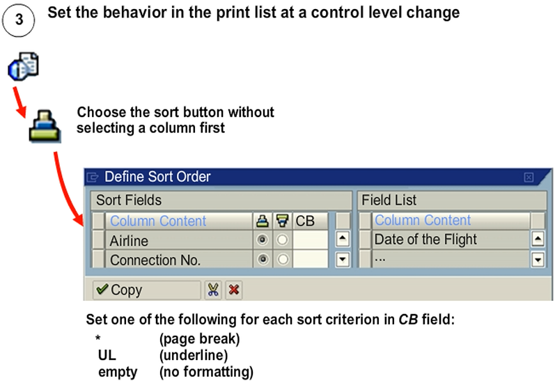 This step only works in interactive mode and not in background processing. For background processing, you must specify the settings for sort order and control level formatting in the it_sort parameter of the set_table_for_first_display method. To specify these settings, assign * or UL to the GROUP field in the it_sort parameter.