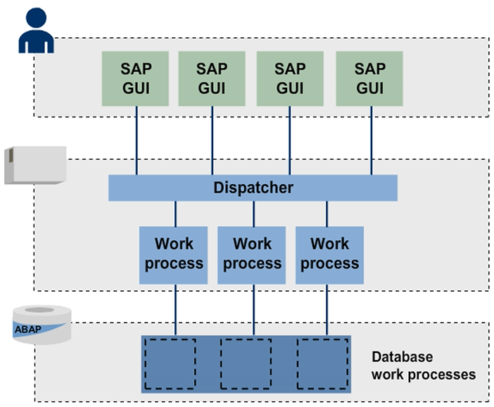 Releasing the work process before each user dialog ensures that the user actions, which usually last longer, do not block any work processes on the application server and, particularly, on the database server, which significantly reduces the load on the database server. When a user has completed processing the screen, the user context is “rolled in” with the program context. The user is returned to a work process for processing. The screen then requires internal program processing.