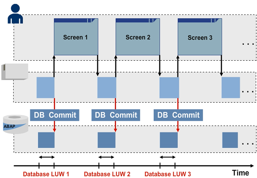 Hint: Due to the implicit database commits triggered at the end of a dialog step, changes that belong to an SAP LUW may not be placed in different dialog steps. This is because these steps may not be in the same database LUW.