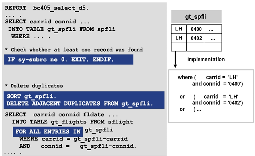It is recommended that you use the FOR ALL ENTRIES addition when the first set of data is not being read from the database and is already available in the program, for example, if the user has input the data. Otherwise, a join is recommended.