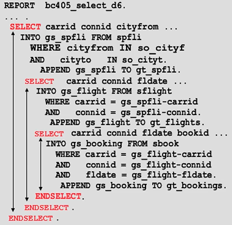 The major disadvantage of nested SELECT statements is that the inner SELECT is executed for each record that is retrieved by the outer SELECT statements. Under these circumstances, good performance is only possible if you ensure that the table with the smallest number of expected records is outermost in the nesting structure.